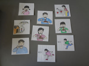 使用方法 @絵カードを数枚並べておく。 A話し手は、絵カードの中から「誰が何をどうする」の文を作って言う。 B取り手は、話をよく聞いて文に合った絵カードを探して取る。 |